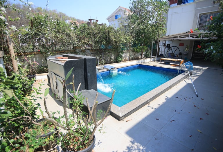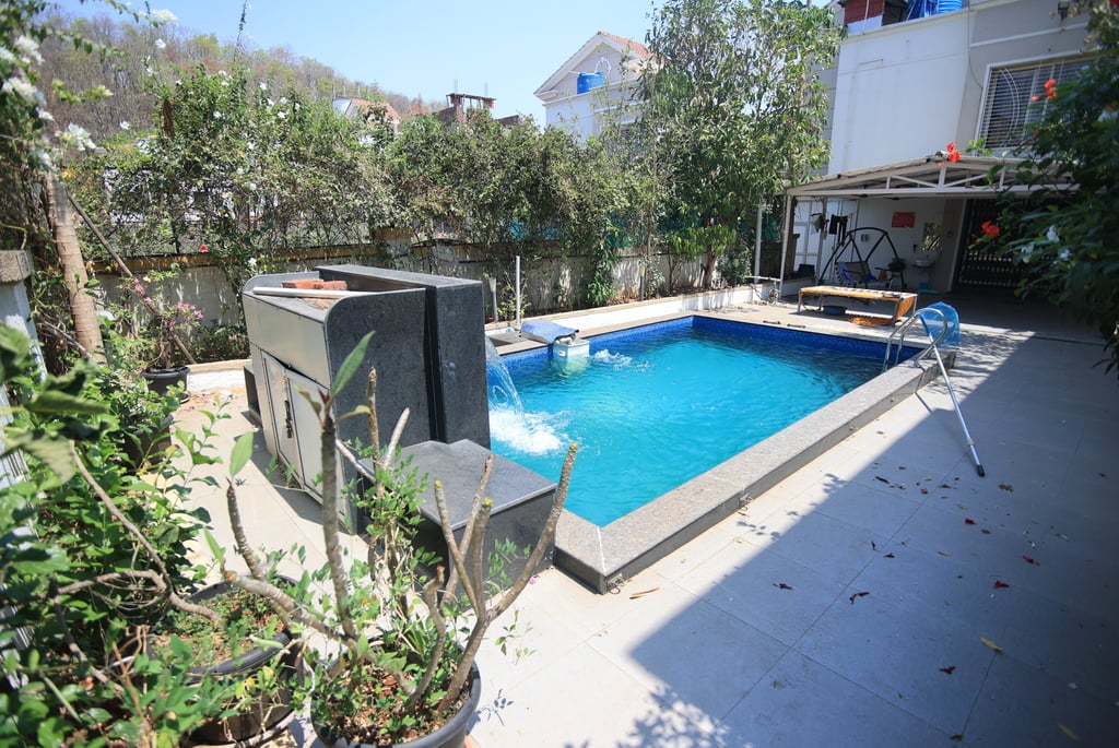 Dive into our serene swimming pool surrounded by lush greenery, perfect for relaxation.
